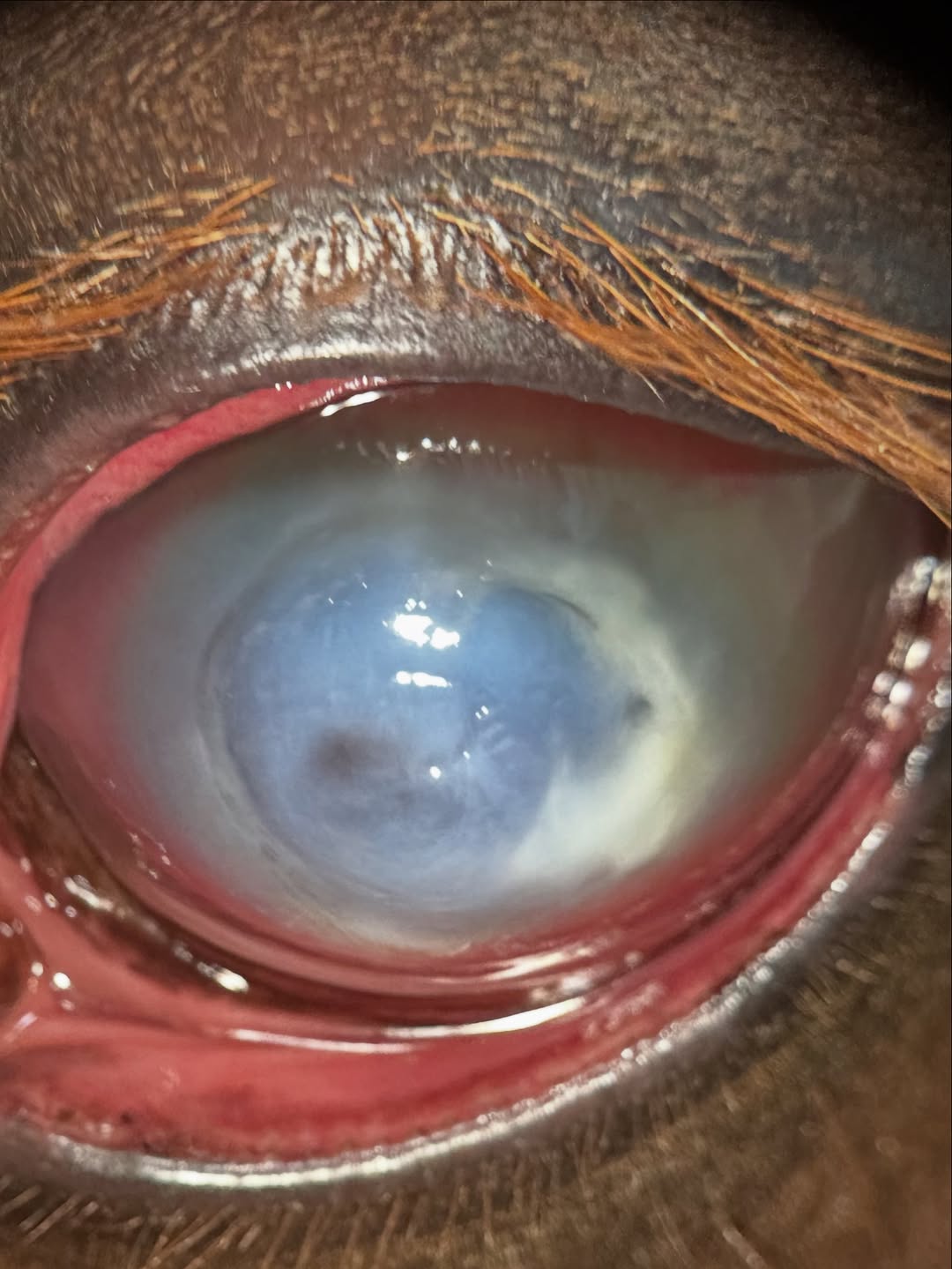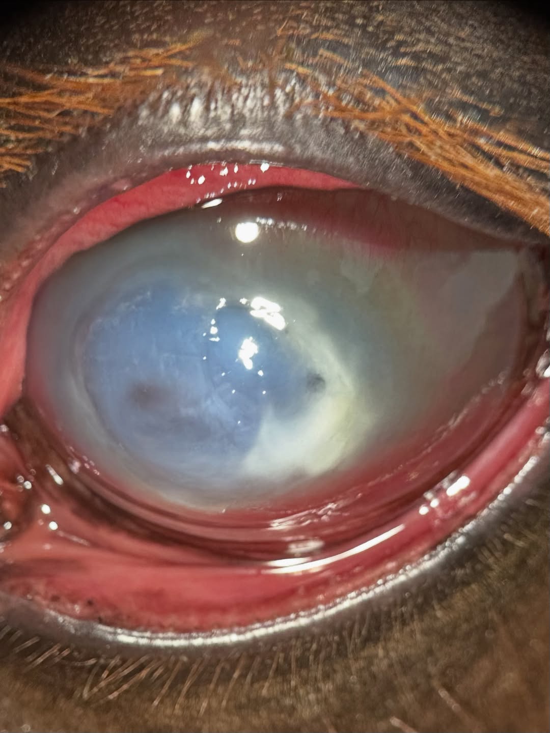 Fortunately we were able to treat this young mare aggressively, and in the third photo she is completely healed. There is an area of scarring and granulation tissue in the middle of the cornea, which is the pinkish spot, but that scar will fade over the next few months. She can see around it, and should end up with pretty normal function long term!