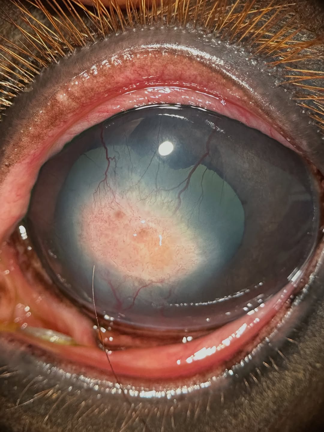 This horse was initially seen about a month ago and diagnosed with a corneal abscess, as seen in the first two photos. Basically a nasty corneal ulcer that became infected, and sealed over with bacteria and/or fungus trapped in the deeper layers of the cornea. This is unfortunately common in horses and can be really difficult to treat.
