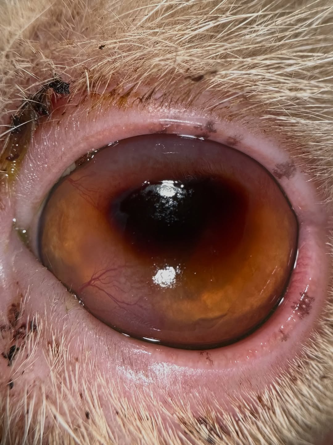 This cat was referred due to concerns about a dilated pupil in the left eye and possible glaucoma. She is a brachycephalic (Persian) kitty and as you can see, she actually has a corneal problem! This cat has a corneal sequestrum, which is a necrotic, dead piece of cornea. These occur exclusively in cats and are associated with chronic corneal irritation like from a corneal ulcer, or nasal entropion and exposure such as in any brachycephalic cat! There is also a link to feline herpes virus, especially in non-brachycephalic cats.
