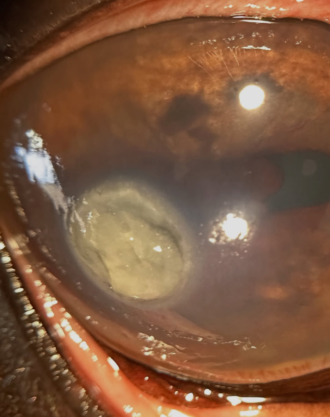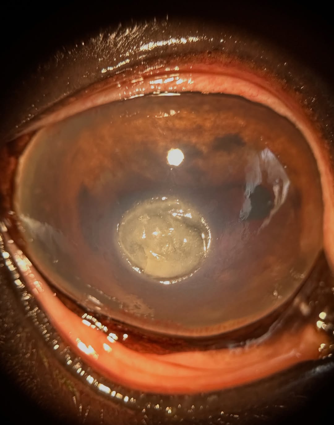 This one has me pretty concerned. You can see the start of a moat or furrow at the top right of the lesion, a deep area that is generally associated with rapid corneal damage occurring. This gives away how deep the lesion really is even though the rest of it doesn’t look too bad - most of that is necrotic cornea and inflammatory debris.