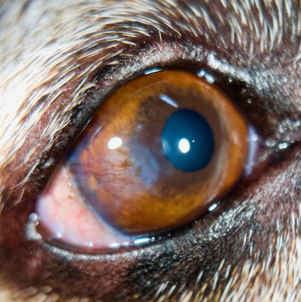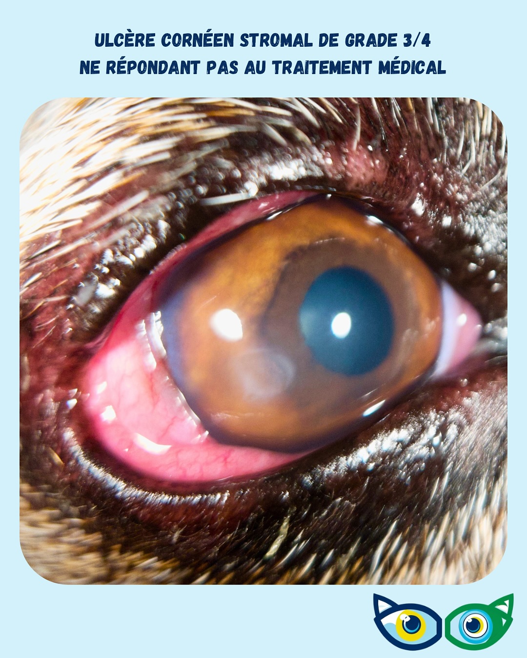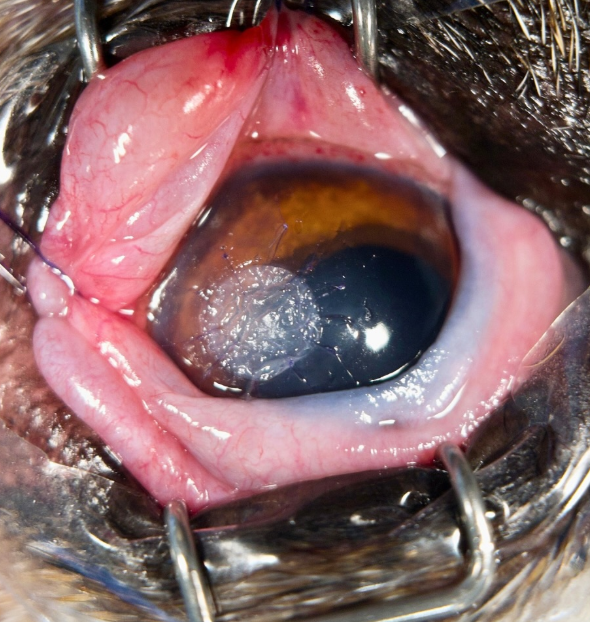 A mid-stromal corneal ulcer unresponsive to medical treatment was observed. Ophthalmologic exam found no intrinsic cause. Surgical management included a keratectomy and grafting with dehydrated amniotic membrane (Vetrix EyeQ).
