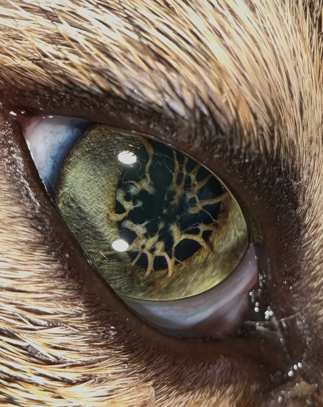 Worms in the eyes? NOPE! Much prettier - these are persistent pupillary membranes (PPMs). PPMs are a remnant of fetal vascular tissue that is supposed to regress during development and sometimes fails to go away completely. This kitten has VERY dramatic PPMs, and he can see out of this eye! It just looks amazing. Sometimes these can lead to cataracts or corneal opacities, but there's nothing to worry about in this eye.