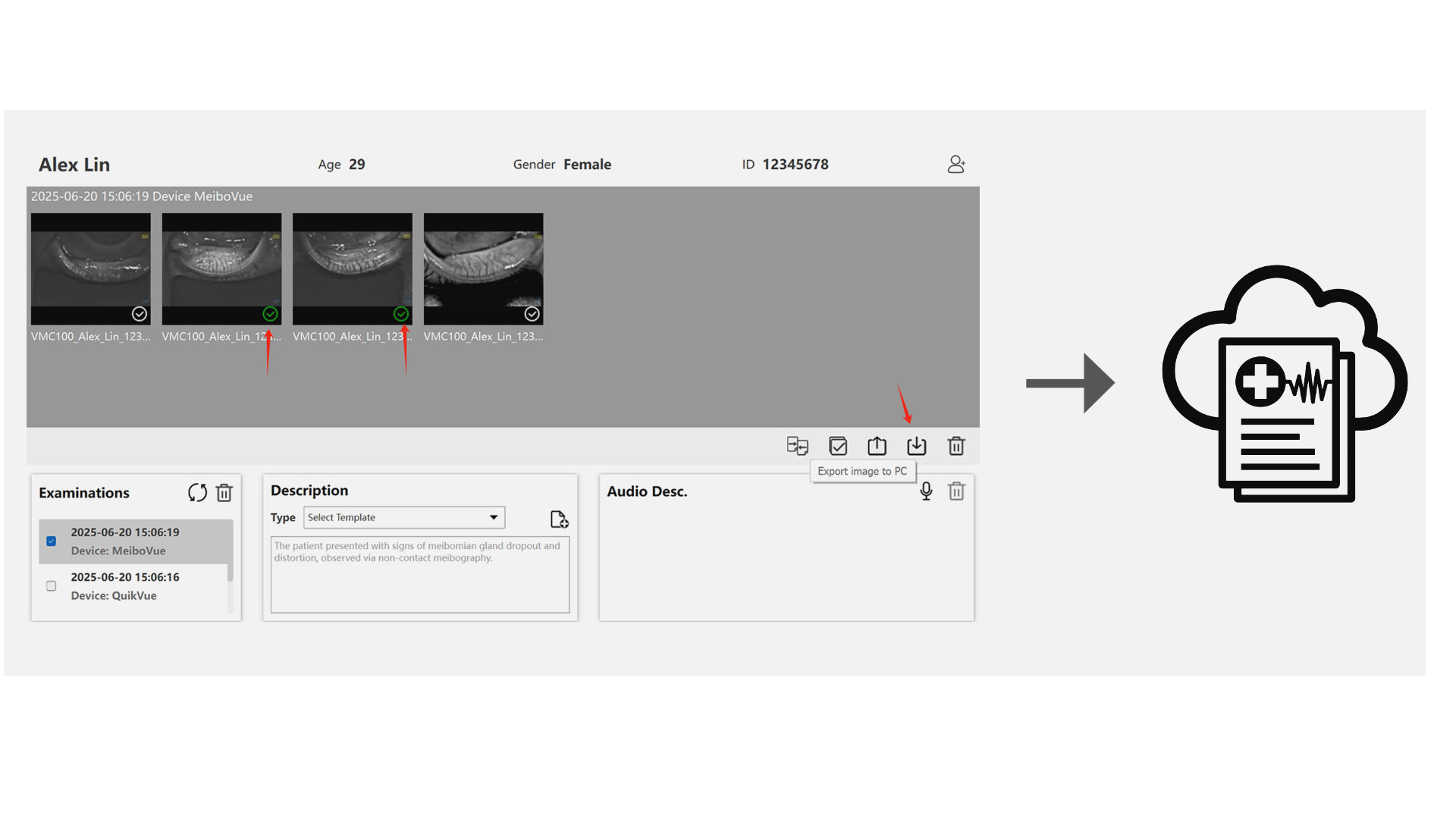Once images from MeiboVue are synced to the PC via VisuDoc, they can be quickly exported to the desktop in standard formats — allowing for seamless upload into EMR/EHR systems. This ensures that clinicians can easily integrate meibography results into each patient's digital medical record, enhancing documentation and continuity of care.